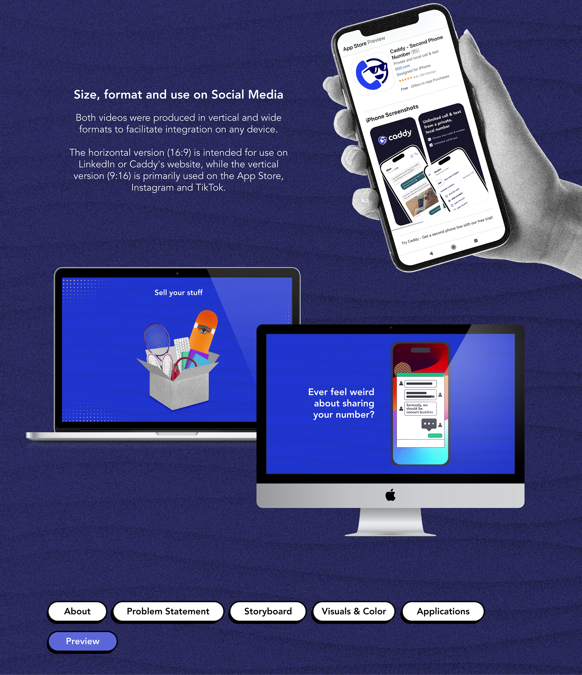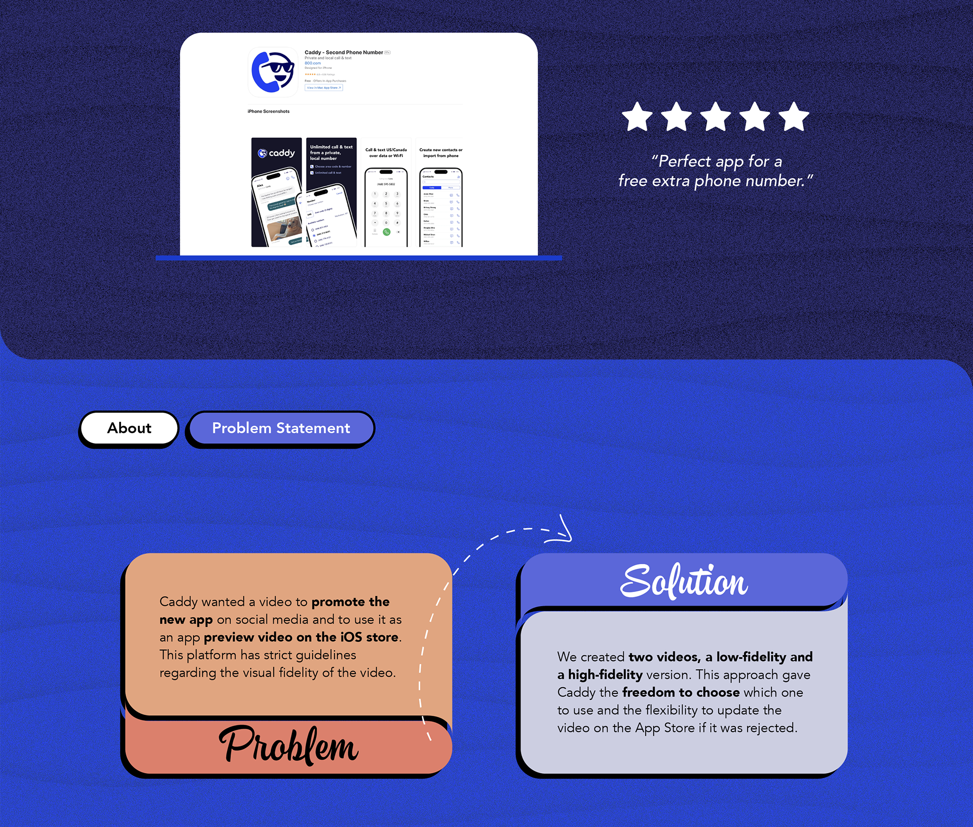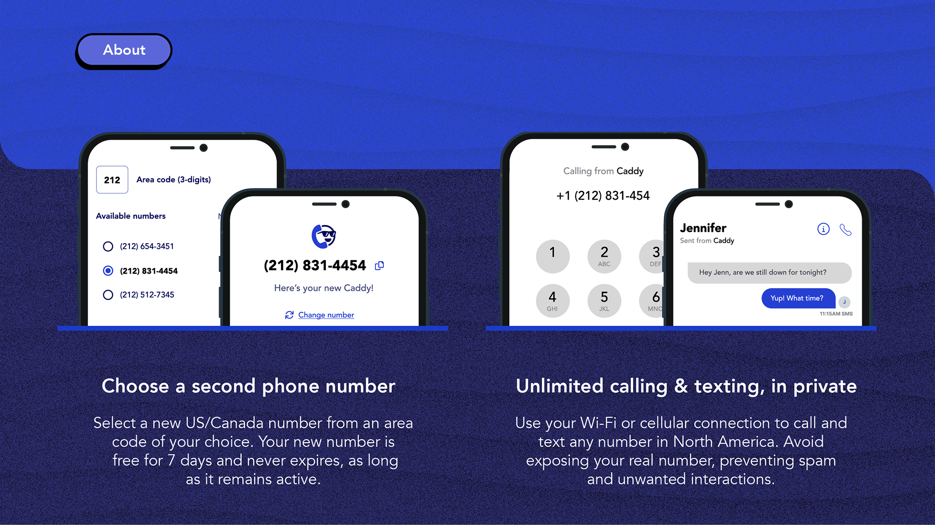 Caddy face the challenge of create two videos (Motion Graphics); one for the Apple Store, very faithful to the real product and another more creative to promote the application and its services on social networks. Our work was to create a visual and narrative experience with the interfaces and menus (UI/UX) of the original application. Animate a second video with more creative freedom and eye-catchin visuals for potential new users. WHAT IS CADDY? Choose a second phone number Select a new US/Canada number from an area code of your choice. Your new number is free for 7 days and never expires, as long as it remains active. Unlimited calling & texting, in private Use your Wi-Fi or cellular connection to call and text any number in North America. Avoid exposing your real number, preventing spam and unwanted interactions.